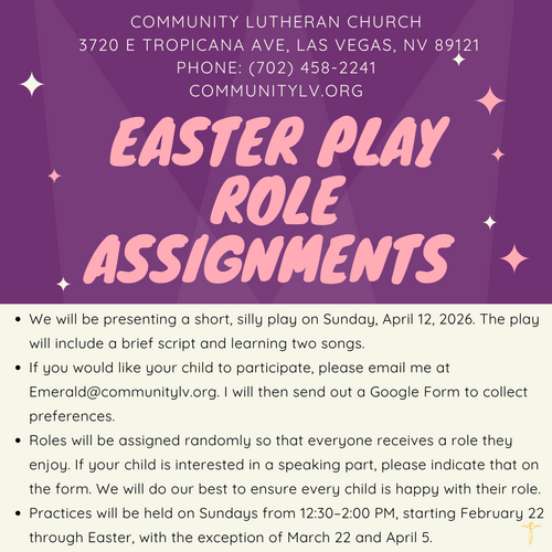 The next First Communion class is Sunday, April 19th and Sunday April 26th, 2025 from 12-2 p.m. Then 1st Communion Service is on Sunday, May, 3, 2026 during the 11 a.m. Worship service. For more information please contact the church office at 702-458-2241.